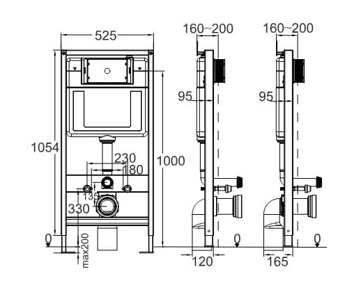 Rysunki techniczne przedstawiają szczegółowe wymiary stelaża: szerokość 525 mm, wysokość 1054 mm, oraz głębokość instalacyjną regulowaną od 160 do 200 mm. Precyzyjnie opisane detale techniczne, takie jak wymiary otworów i odległości montażowe, umożliwiają dokładne zaplanowanie instalacji. Produkt posiada uniwersalne mocowania i jest kompatybilny z różnorodnymi przyciskami spłukującymi.